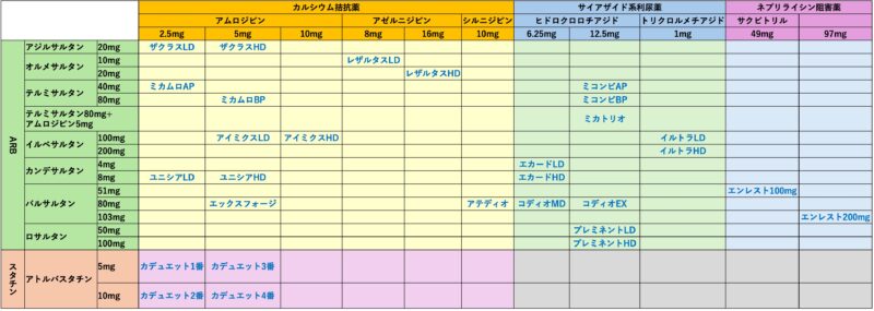 これらの複数の薬を1つにまとめた、“配合薬”があります。2つの薬が1つにまとまっているので便利です。2種類の薬を別々に内服するより、配合剤にした方が降圧効果が高いとするデータがあります。