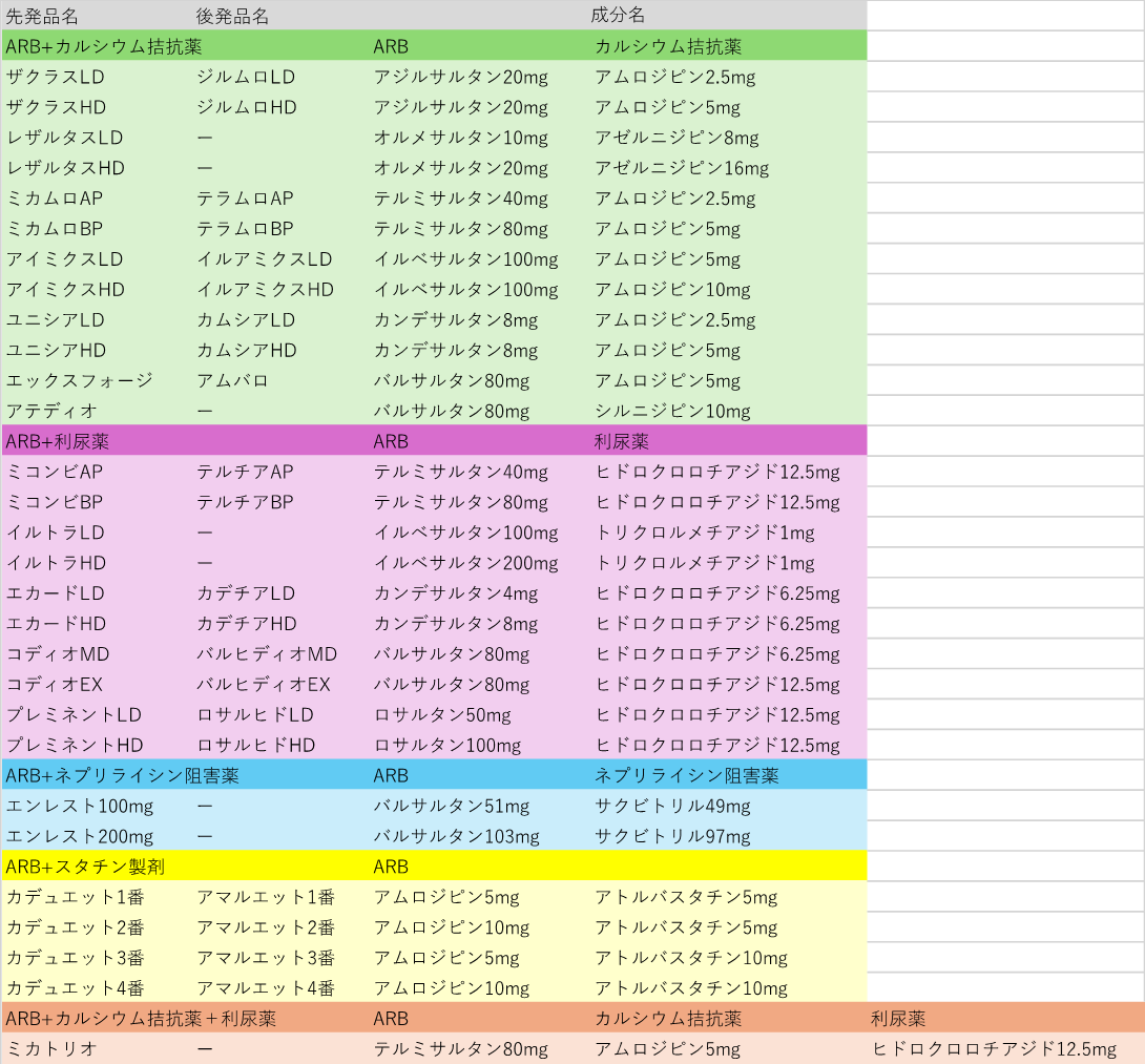 アンギオテンシンⅡは、血管収縮やアルドステロンというホルモンの分泌を促進することで血圧を上昇させる物質です。ARBは、アンギオテンシンⅡと受容体の結合を阻害することで、アンギオテンシンⅡによる血管収縮やアルドステロンの分泌を抑制します。降圧については効果の大きい順に、アジルサルタン→オルメサルタン→テルミサルタン→イルベサルタン→カンデサルタン→バルサルタン→ロサルタンと言われています。
